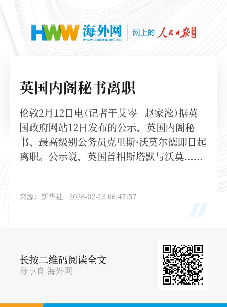新华社伦敦2月12日电(记者于艾岑 赵家淞)据英国政府网站12日发布的公示,英国内阁秘书、最高级别公务员克里斯·沃莫尔德即日起离职。