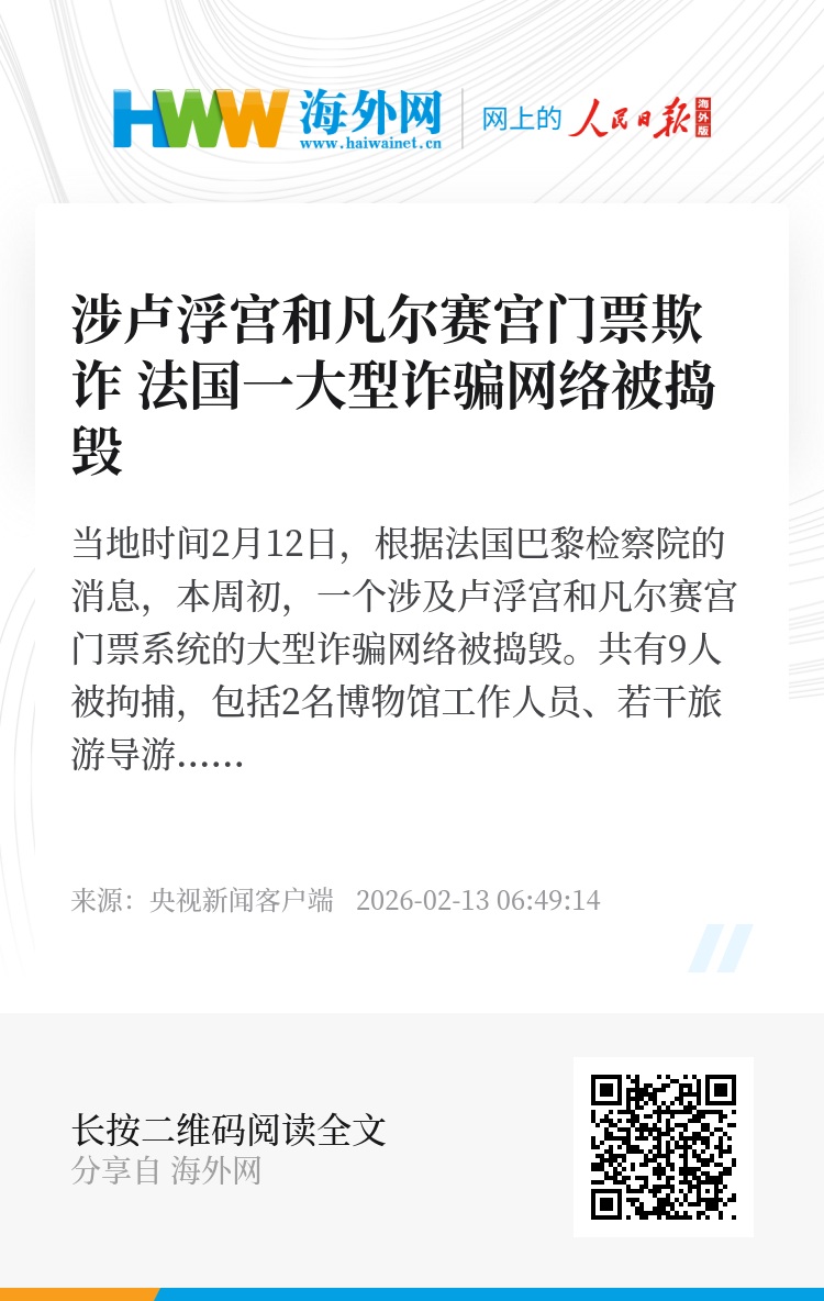 当地时间2月12日,根据法国巴黎检察院的消息,本周初,一个涉及卢浮宫和凡尔赛宫门票系统的大型诈骗网络被捣毁。共有9人被拘捕,包括2名博物馆工作人员、若干旅游导游,以及1名被怀疑为该网络组织者的人。