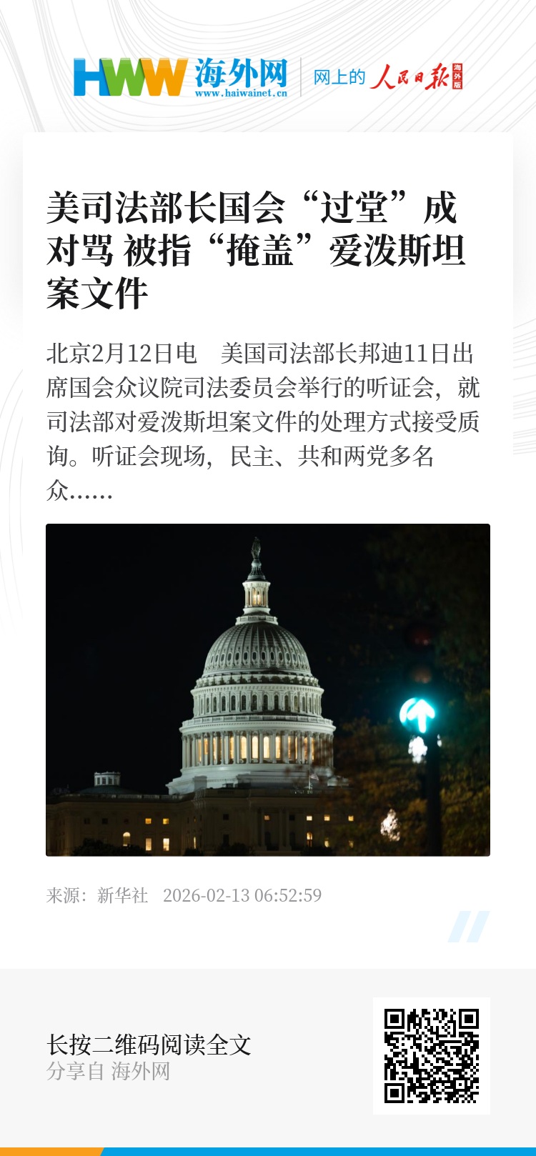 新华社北京2月12日电 美国司法部长邦迪11日出席国会众议院司法委员会举行的听证会,就司法部对爱泼斯坦案文件的处理方式接受质询。听证会现场,民主、共和两党多名众议员质疑邦迪“掩盖”相关文件内容,邦迪则屡次拒绝直接回答民主党籍议员提问,部分回应甚至出言不逊。
