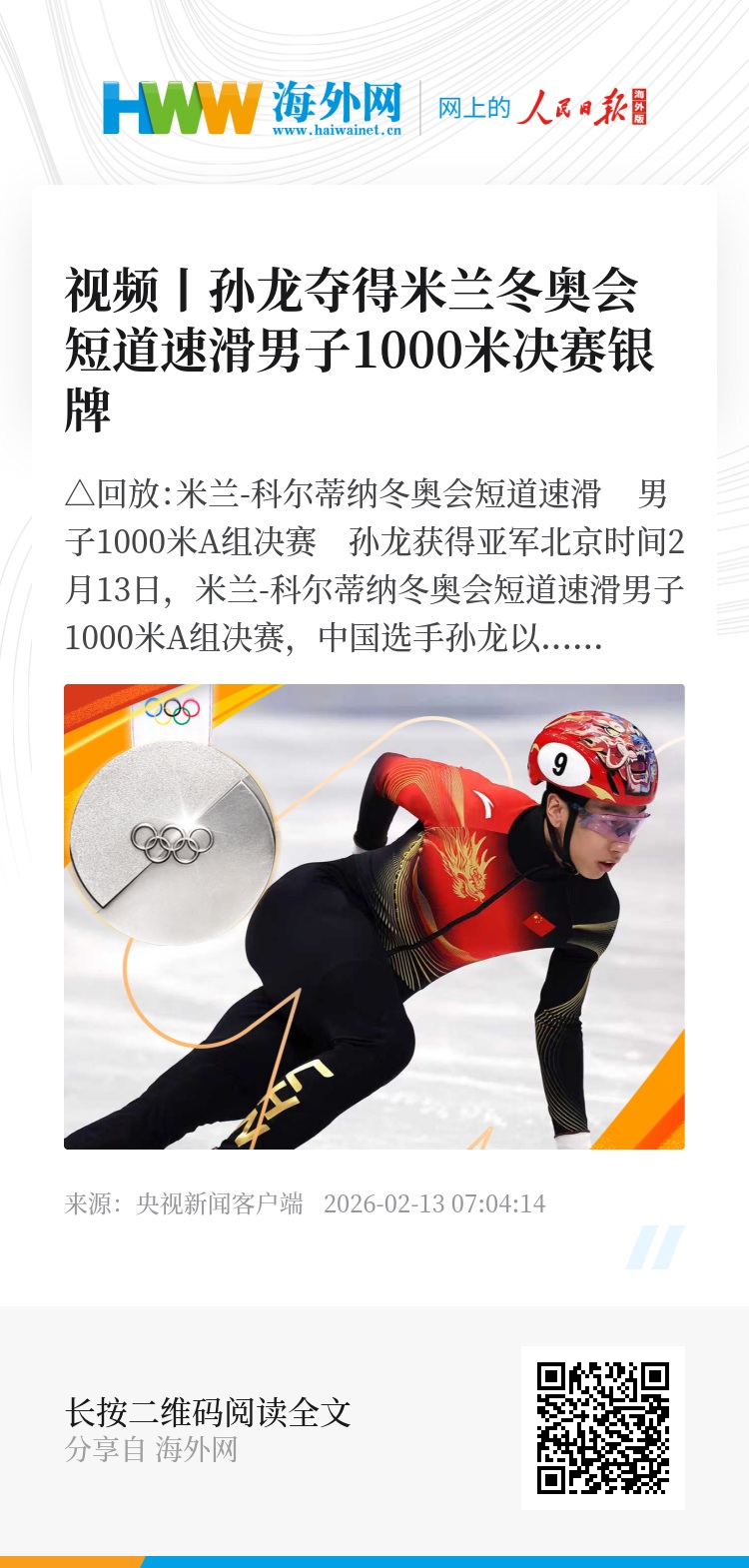 北京时间2月13日,米兰-科尔蒂纳冬奥会短道速滑男子1000米A组决赛,中国选手孙龙以1分24秒565的成绩获得亚军。冠军归属于荷兰选手范特沃特。