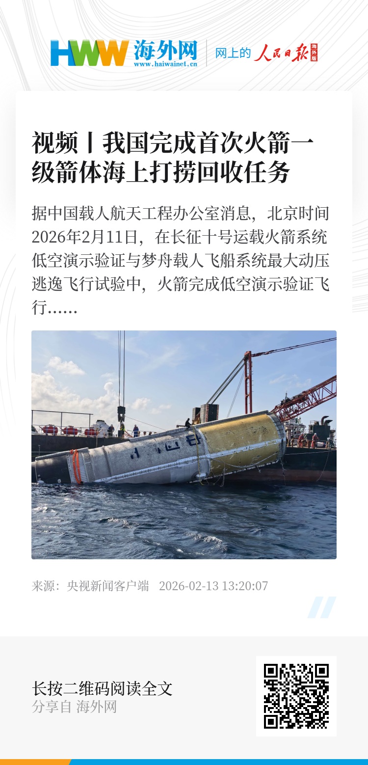 2月13日上午,海上搜索回收分队完成火箭一级箭体打捞回收任务。这是我国首次在海上实施运载火箭搜索回收任务,对推进运载火箭可重复使用技术发展具有重要意义。