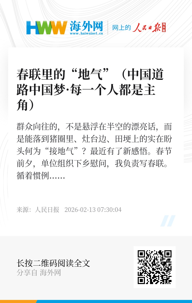 再说回春联。其实写春联,写的不仅仅是祝福,更是广大群众对这片土地的款款深情和殷殷希望,映照着每个劳动者孜孜以求的中国梦。走在这条追梦路上,像耕耘土地一样耕耘事业,弯下腰去、躬行践履,接得住地气,才能收获沉甸甸的果子、热气腾腾的日子。