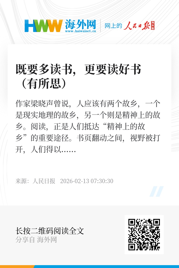 既要多读书,更要读好书。当越来越多的人爱上阅读,并追求高质量阅读时,书香社会建设定会迈上新台阶。(刘雨瑞)