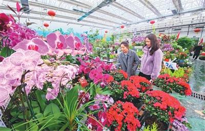 2月8日,新疆维吾尔自治区昌吉市花儿小镇花卉市场,各类年宵花争奇斗艳,吸引了不少市民前来选购。