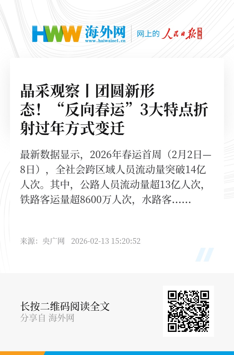 最新数据显示,2026年春运首周(2月2日—8日),全社会跨区域人员流动量突破14亿人次。其中,公路人员流动量超13亿人次,铁路客运量超8600万人次,水路客运量超490万人次,民航客运量超1600万人次。