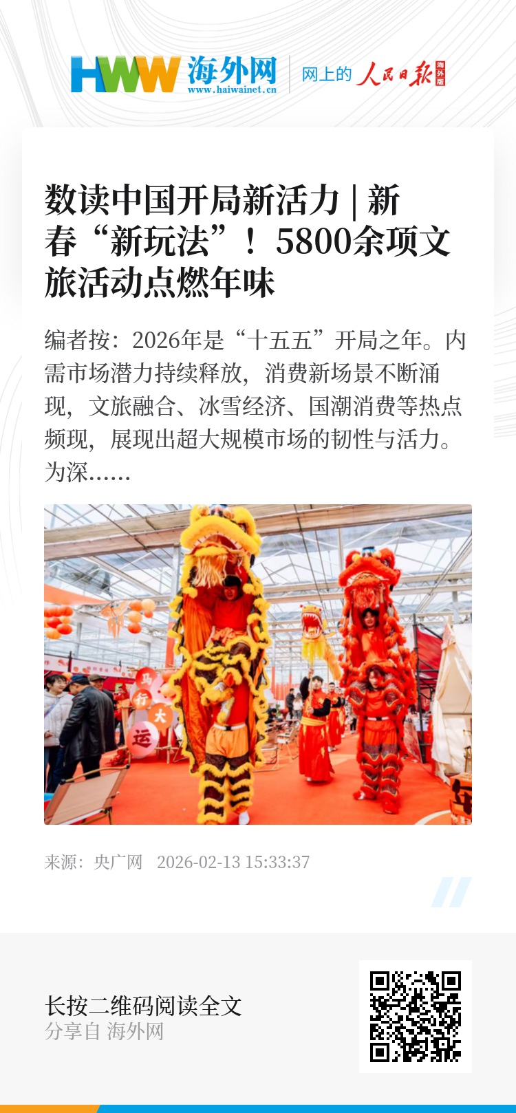 编者按:2026年是“十五五”开局之年。内需市场潜力持续释放,消费新场景不断涌现,文旅融合、冰雪经济、国潮消费等热点频现,展现出超大规模市场的韧性与活力。为深入解读开局新气象,央广网推出《数读中国开局新活力》系列报道,以数据为支撑,聚焦各地消费场景、产业升级与民生改善的生动实践,呈现中国经济稳中求进、活力迸发的时代图景。