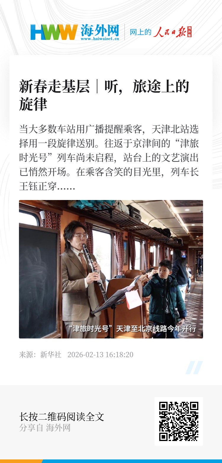结合春运与春节假期,“津旅时光号”文旅专列天津北站—北京站线路增开至4个班次。班次在变多,时光在变慢。这趟开往春天的列车,正把匆匆的旅途,变成念念不忘的回忆。