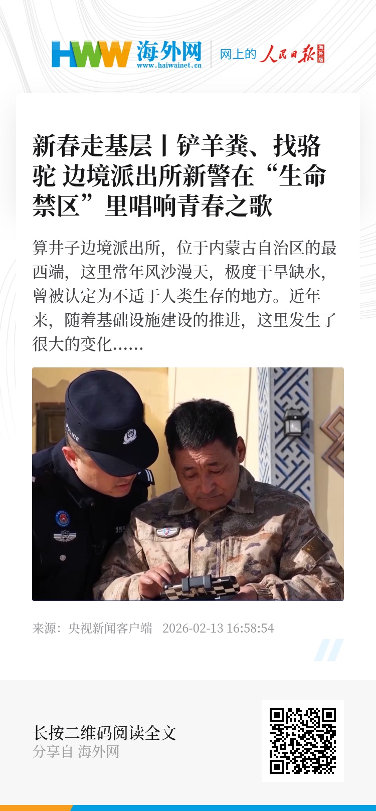 10名新警,都是二十几岁的年纪,2025年8月,通过国家移民管理机构公开招录,他们成了内蒙古边检总站的实习民警,在阿拉善各边境派出所开始了为期一年的轮训,今年2月,新警们刚来算井子报到。今天下午,他们将在所长斯日古楞的带领下,去给辖区的牧民清理羊圈。