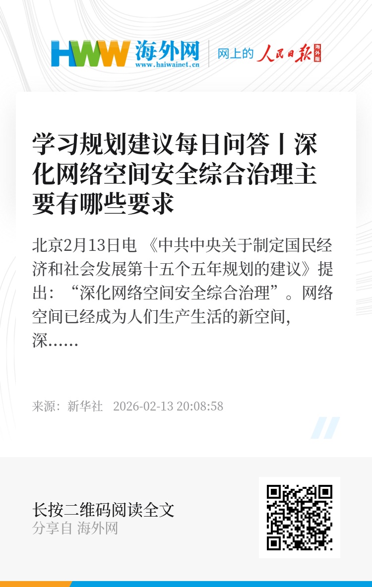 新华社北京2月13日电 《中共中央关于制定国民经济和社会发展第十五个五年规划的建议》提出:“深化网络空间安全综合治理”。网络空间已经成为人们生产生活的新空间,深化网络空间安全综合治理是提高公共安全治理水平的重要内容和紧迫任务。