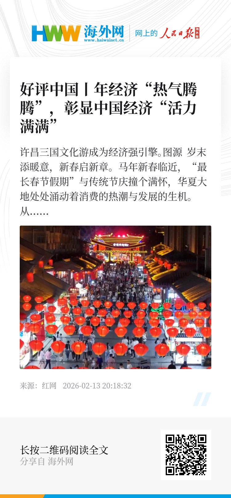 烟火暖人心,奋进正当时。热气腾腾的年经济是承载团圆与喜悦的消费盛宴,更是“十五五”开局之年的良好开端;既是团圆的喜悦,更是发展的信号。站在新的历史起点上,依托深厚的经济韧性、巨大的内需潜力、持续的政策赋能,中国经济必将在新的一年里持续向好、行稳致远。而这股热气腾腾的年经济活力,也将持续转化为推动高质量发展的强大动力,见证中国经济的韧性与担当,书写新时代中国经济发展的新篇章。