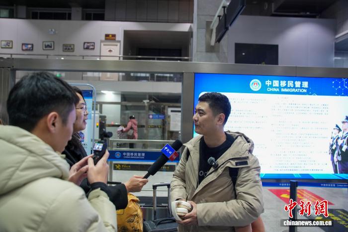 图为中国旅客朱良东从友谊关口岸入境后接受中新网记者采访。陈冠言 摄