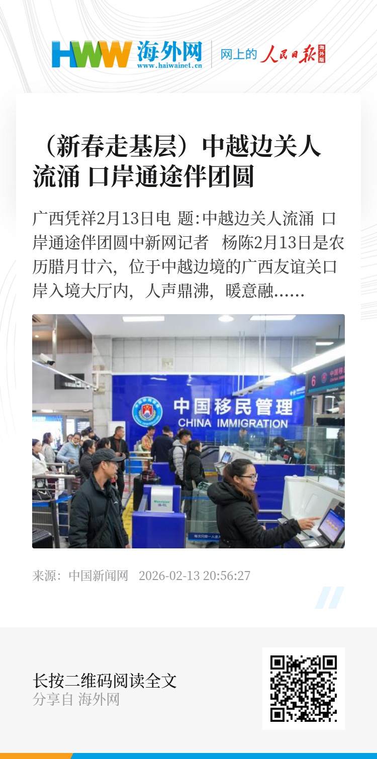 2月13日是农历腊月廿六,位于中越边境的广西友谊关口岸入境大厅内,人声鼎沸,暖意融融。返乡探亲、跨境旅游的旅客络绎不绝,拖着装满年货的行李箱,步履匆匆却难掩喜悦。