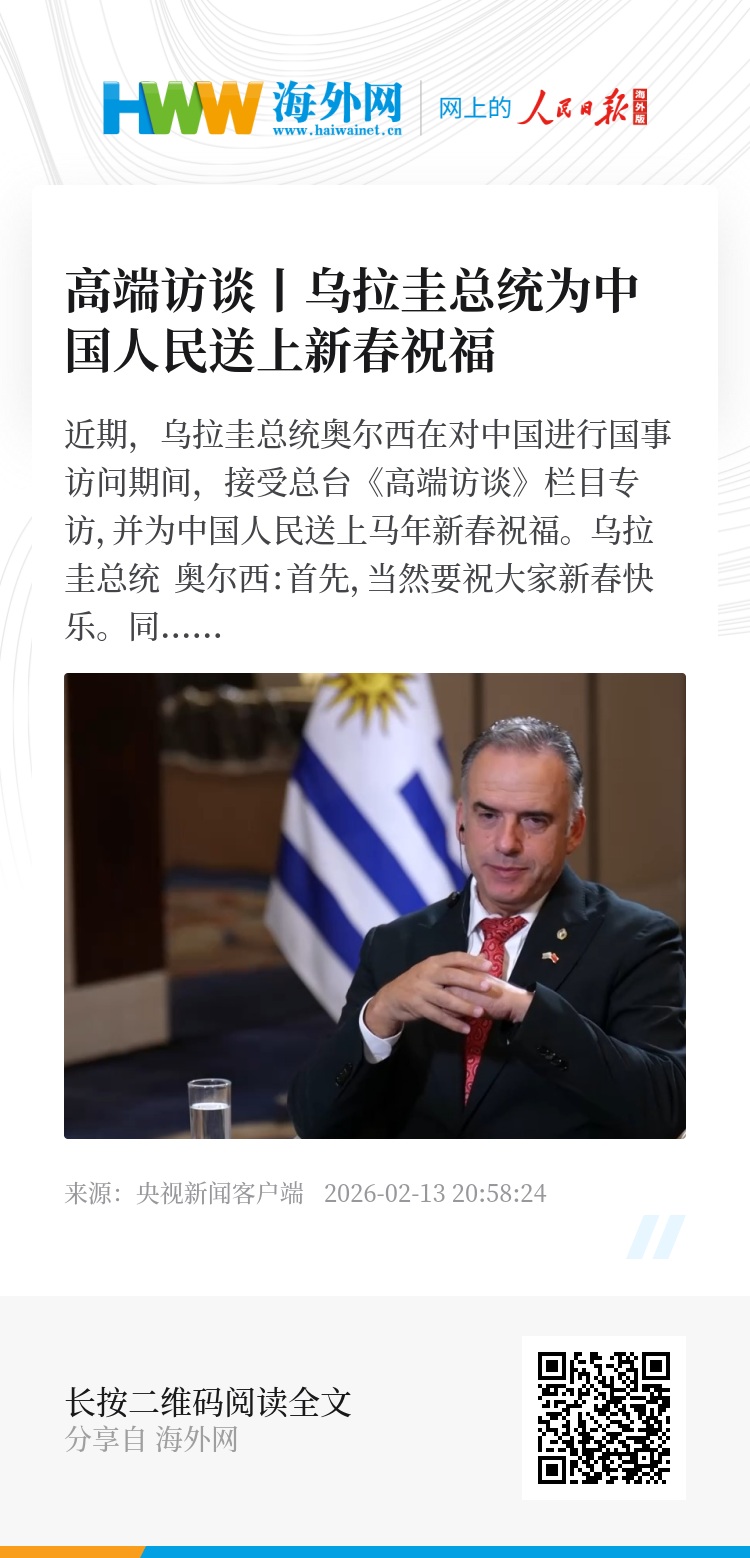 近期,乌拉圭总统奥尔西在对中国进行国事访问期间,接受总台《高端访谈》栏目专访,并为中国人民送上马年新春祝福。