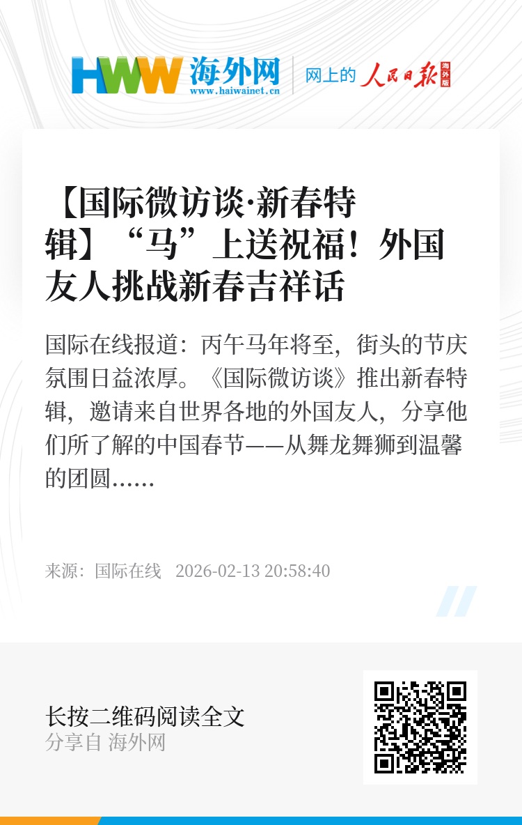 镜头前,外国朋友热情分享了各自家乡庆祝新年的独特传统,并发挥“天马行空”的想象力挑战“马”字成语拼读和释义。点击视频,让我们携手聆听五湖四海的新春祝福,在欢声笑语中共同开启一个龙马精神、气象一新的马年!(谢诗佳 冯启坤 刘朱鹮)