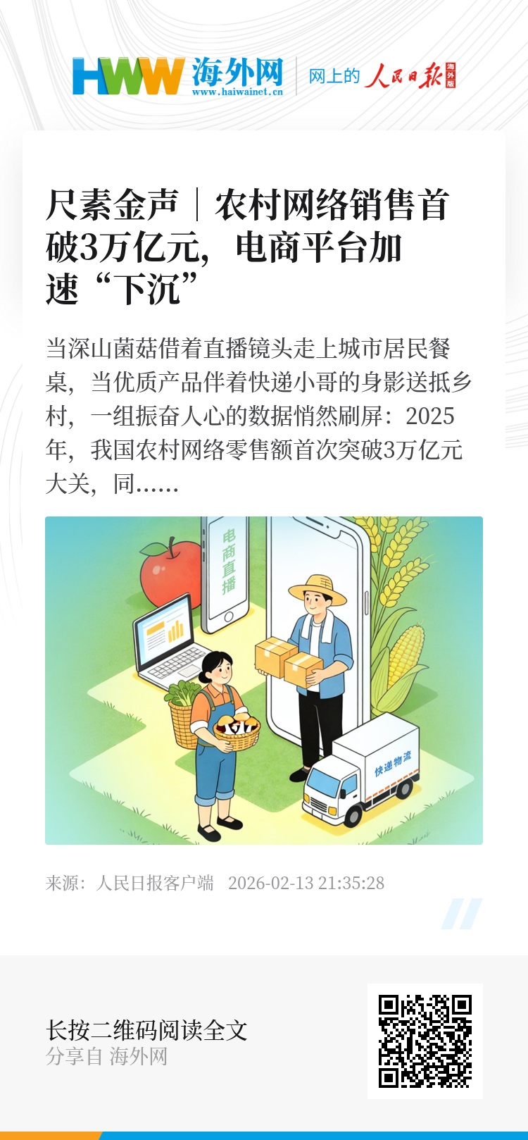 当深山菌菇借着直播镜头走上城市居民餐桌,当优质产品伴着快递小哥的身影送抵乡村,一组振奋人心的数据悄然刷屏:2025年,我国农村网络零售额首次突破3万亿元大关,同比增长6.7%。农产品网络零售额达7833.1亿元,同比增长9.9%。