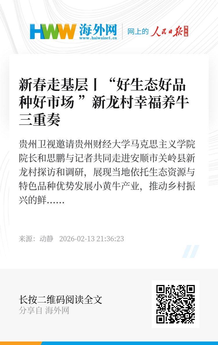 贵州卫视邀请贵州财经大学马克思主义学院院长和思鹏与记者共同走进安顺市关岭县新龙村探访和调研,展现当地依托生态资源与特色品种优势发展小黄牛产业,推动乡村振兴的鲜活实践。