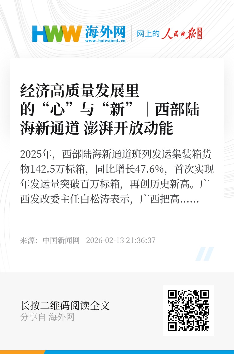 2025年,西部陆海新通道班列发运集装箱货物142.5万标箱,同比增长47.6%,首次实现年发运量突破百万标箱,再创历史新高。广西发改委主任白松涛表示,广西把高水平共建西部陆海新通道作为开放发展的牵引工程,坚持建通道和强运营齐抓,拓合作与促融合并举,通道凝聚力、竞争力不断增强。