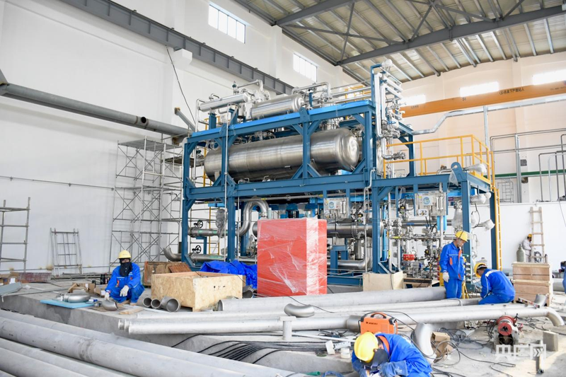福建省绿氢中试基地厂房内工人正在组装设备(央广网记者 张子剑 摄)