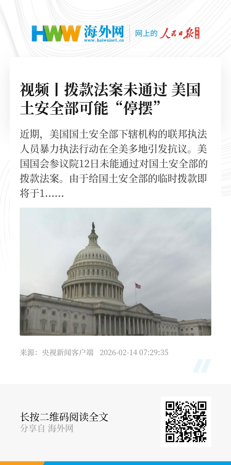 近期,美国国土安全部下辖机构的联邦执法人员暴力执法行动在全美多地引发抗议。美国国会参议院12日未能通过对国土安全部的拨款法案。由于给国土安全部的临时拨款即将于13日到期,该部门可能很快面临“停摆”。