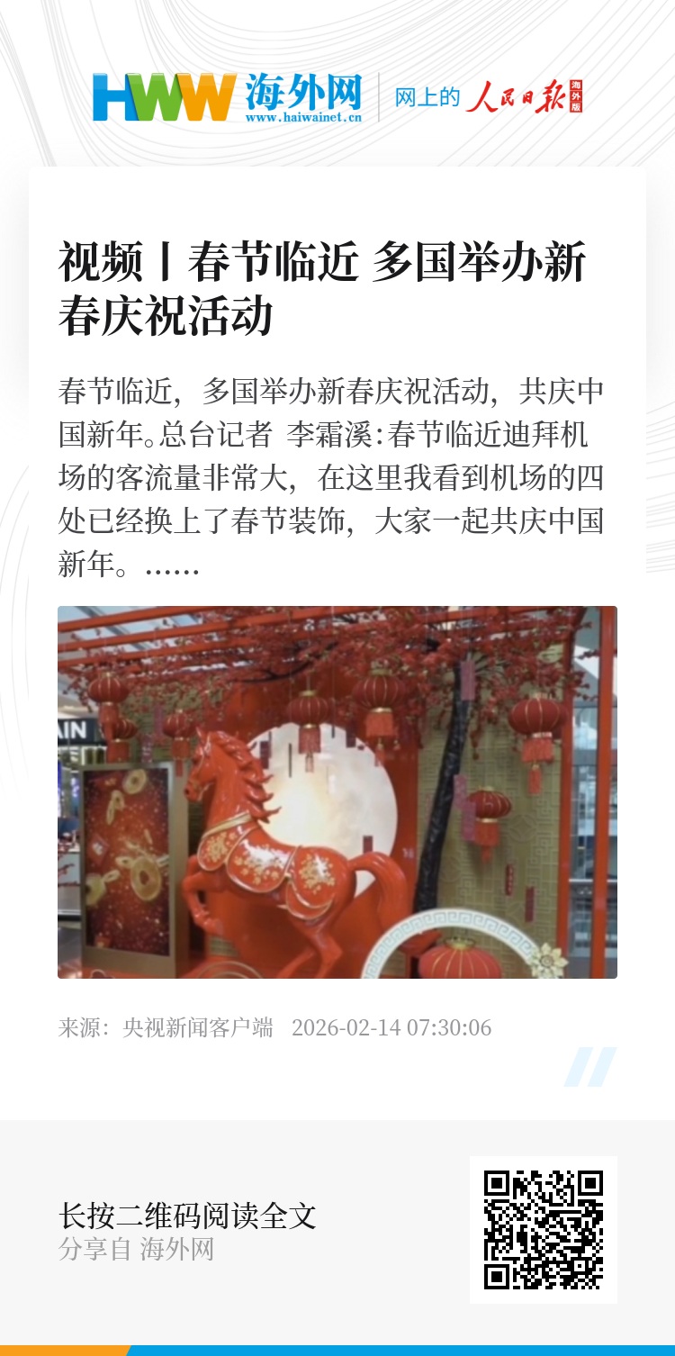 在阵阵锣鼓声中,身着传统服饰的表演者们挥舞长旗,在迪拜机场演绎出一场视觉盛宴。与此同时,机场全线换上“中国红”主题装饰,营造出浓厚的节日气氛。在机场迎春活动上,总台春晚宣传片连续第7年精彩亮相,总台文创产品同时展出。不少中国旅客表示,在海外看到中国元素倍感亲切,为祖国的发展与强大自豪。
