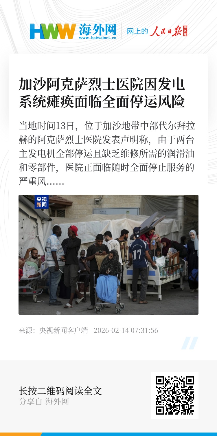 当地时间13日,位于加沙地带中部代尔拜拉赫的阿克萨烈士医院发表声明称,由于两台主发电机全部停运且缺乏维修所需的润滑油和零部件,医院正面临随时全面停止服务的严重风险。