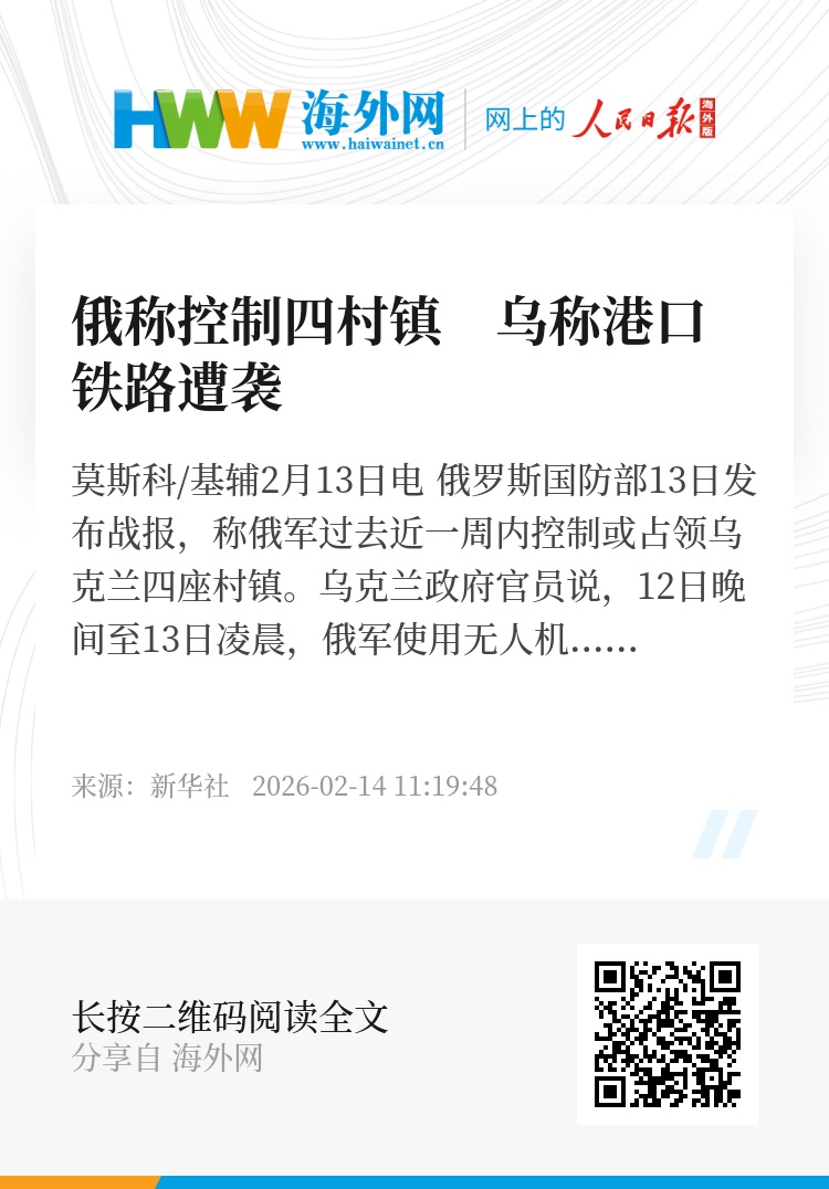 新华社莫斯科/基辅2月13日电 俄罗斯国防部13日发布战报,称俄军过去近一周内控制或占领乌克兰四座村镇。乌克兰政府官员说,12日晚间至13日凌晨,俄军使用无人机袭击敖德萨州一港口,造成人员伤亡。
