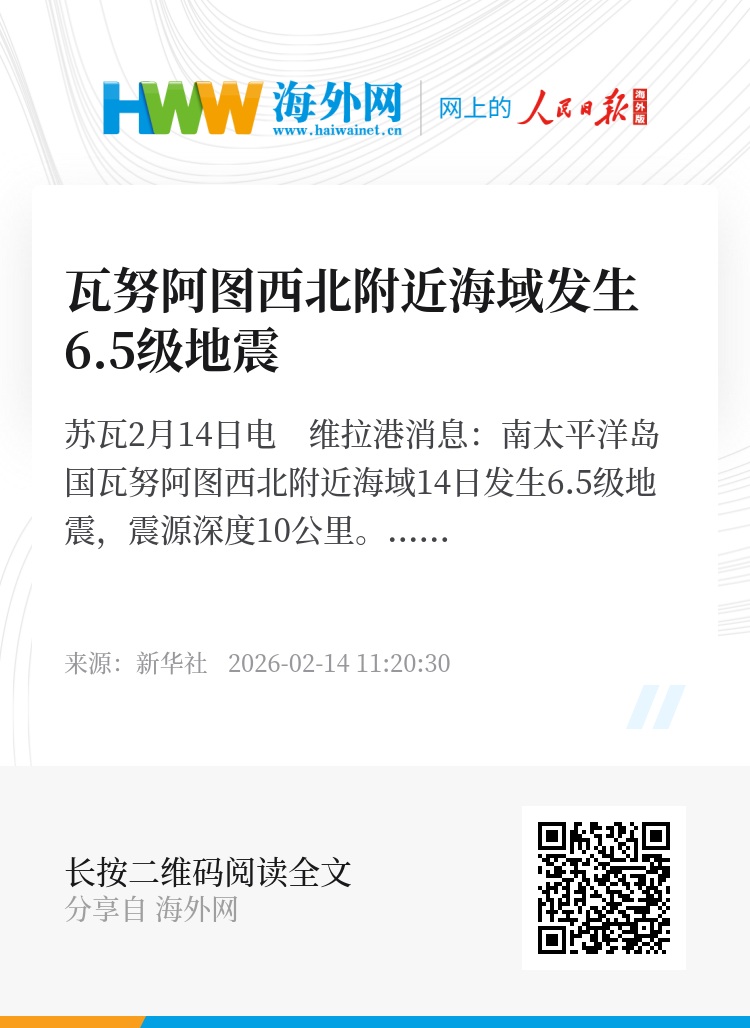新华社苏瓦2月14日电 维拉港消息:南太平洋岛国瓦努阿图西北附近海域14日发生6.5级地震,震源深度10公里。