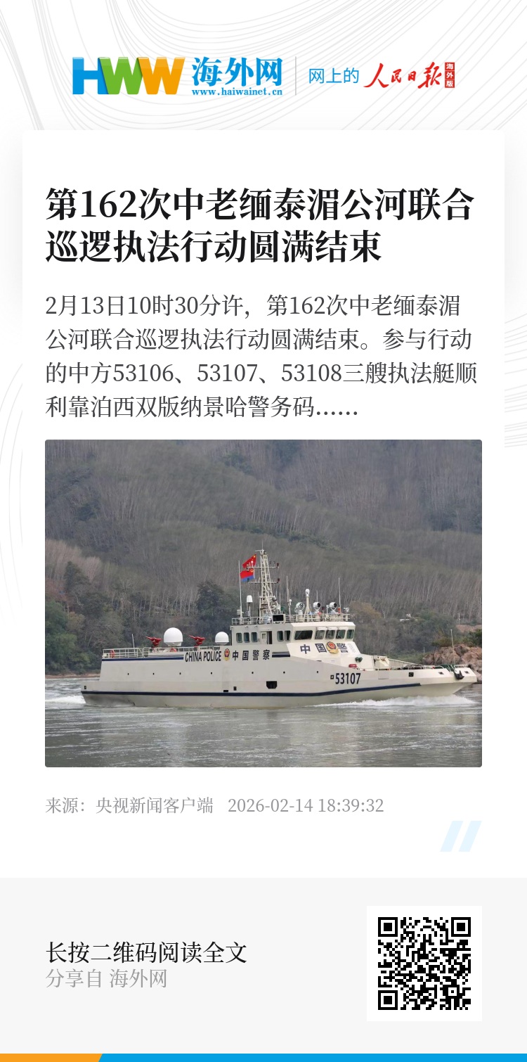 2月13日10时30分许,第162次中老缅泰湄公河联合巡逻执法行动圆满结束。参与行动的中方53106、53107、53108三艘执法艇顺利靠泊西双版纳景哈警务码头,老缅泰三方执法艇及执法队员已安全返回各国。