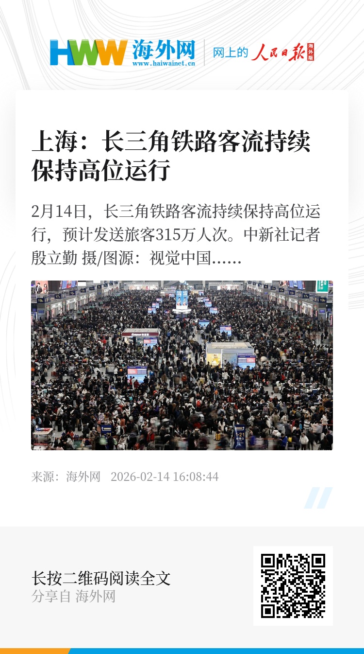 32931330,.上海:长三角铁路客流持续保持高位运行,.2026-02-14 16:08:44,.204428,.张青津、侯兴川