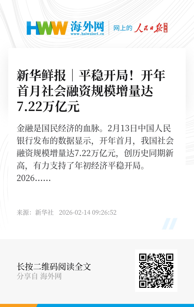 金融是国民经济的血脉。2月13日中国人民银行发布的数据显示,开年首月,我国社会融资规模增量达7.22万亿元,创历史同期新高,有力支持了年初经济平稳开局。
