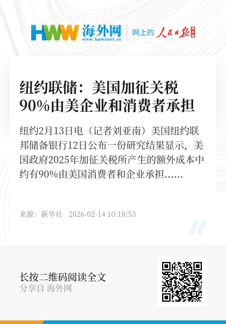 新华社纽约2月13日电(记者刘亚南)美国纽约联邦储备银行12日公布一份研究结果显示,美国政府2025年加征关税所产生的额外成本中约有90%由美国消费者和企业承担。美国政府此前多次宣称,“关税由外国出口商承担”,给美国带来巨额收入。