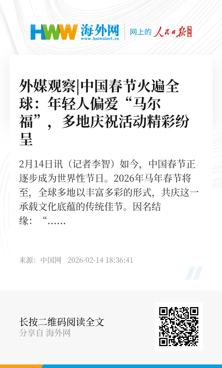中国网2月14日讯(记者李智)如今,中国春节正逐步成为世界性节日。2026年马年春节将至,全球多地以丰富多彩的形式,共庆这一承载文化底蕴的传统佳节。
