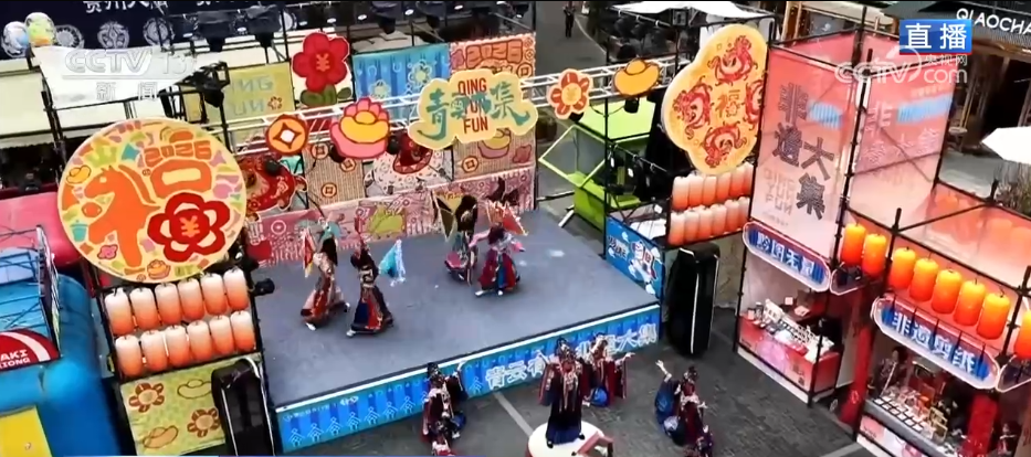 记者来到贵阳市的青云市集,通过航拍镜头可以看到,这里是在贵阳老城区的中心位置。最近几年,贵阳市通过城市更新,把这里改造成了这几年火爆出圈的文旅街区。现在,听见鼓声响起,青云市集为了迎新春而专门打造的“非遗集市”正式开市了,台上正在表演的是贵州省级非物质文化遗产——石阡傩戏。