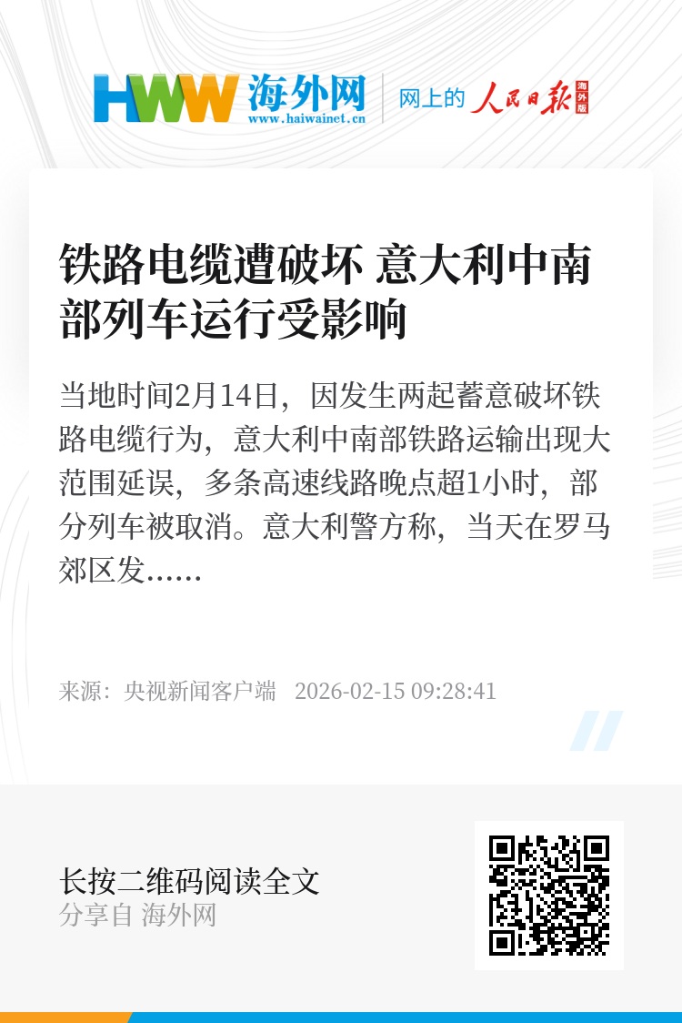 当地时间2月14日,因发生两起蓄意破坏铁路电缆行为,意大利中南部铁路运输出现大范围延误,多条高速线路晚点超1小时,部分列车被取消。