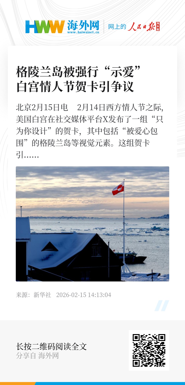 新华社北京2月15日电 2月14日西方情人节之际,美国白宫在社交媒体平台X发布了一组“只为你设计”的贺卡,其中包括“被爱心包围”的格陵兰岛等视觉元素。这组贺卡引发争议,不少网友直指白宫这样做“不合适”,质疑美国政府官员不当使用社交媒体。