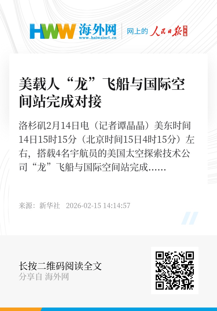 新华社洛杉矶2月14日电(记者谭晶晶)美东时间14日15时15分(北京时间15日4时15分)左右,搭载4名宇航员的美国太空探索技术公司“龙”飞船与国际空间站完成自动对接。