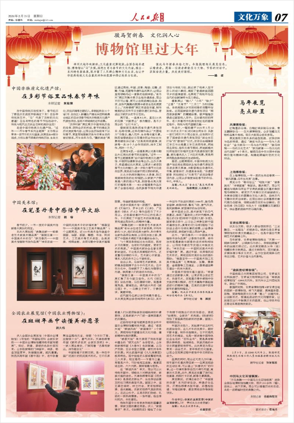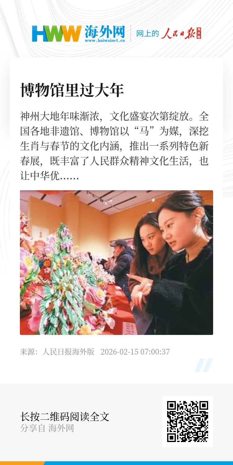 神州大地年味渐浓,文化盛宴次第绽放。全国各地非遗馆、博物馆以“马”为媒,深挖生肖与春节的文化内涵,推出一系列特色新春展,既丰富了人民群众精神文化生活,也让中华优秀传统文化在喜庆祥和的氛围中得以传承与弘扬。