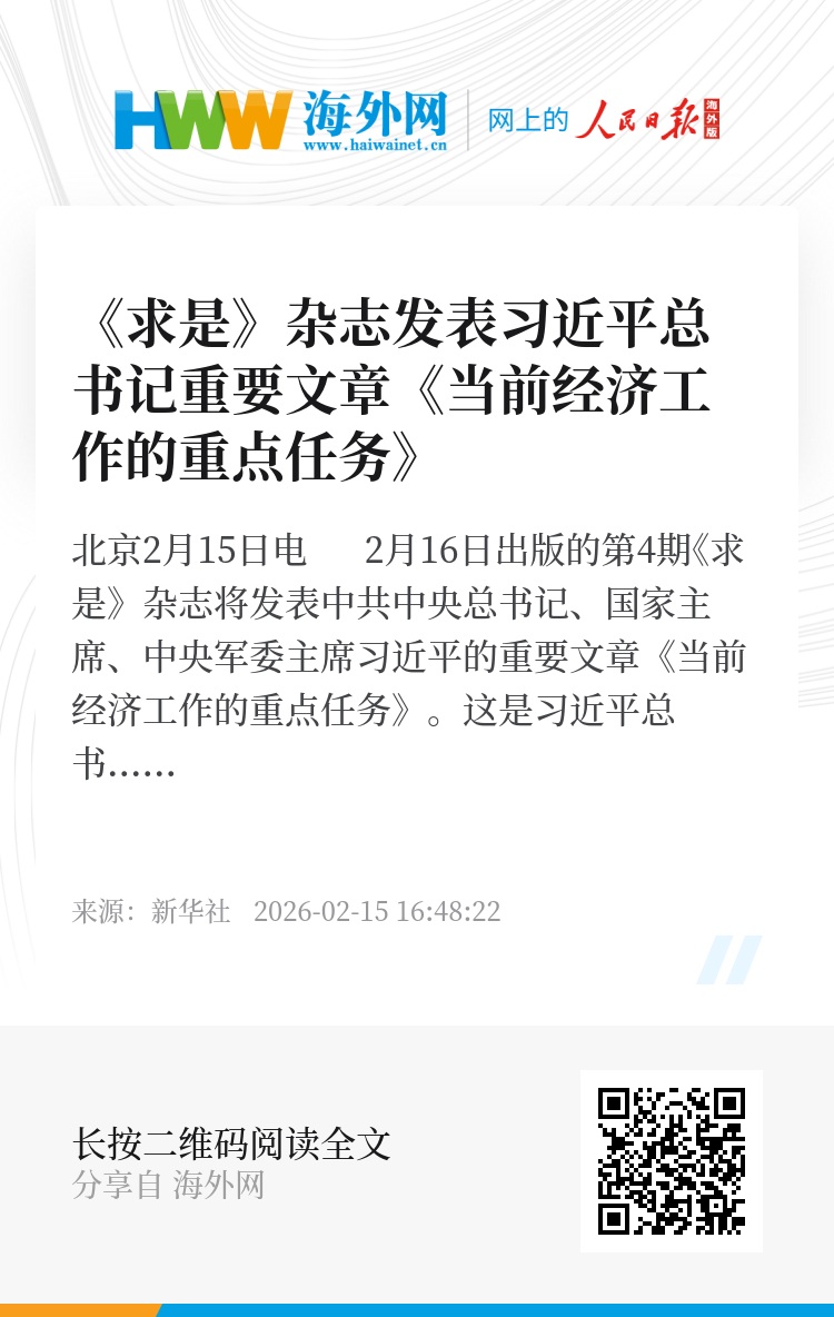 新华社北京2月15日电 2月16日出版的第4期《求是》杂志将发表中共中央总书记、国家主席、中央军委主席习近平的重要文章《当前经济工作的重点任务》。这是习近平总书记2025年12月10日在中央经济工作会议上讲话的一部分。