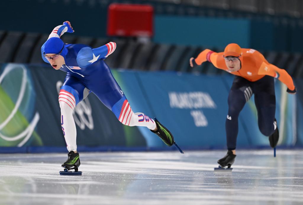 2月11日,美国选手斯托尔兹(左)在比赛中。当日,米兰-科尔蒂纳冬奥会速度滑冰男子1000米决赛在意大利米兰举行。新华社记者 武巍 摄