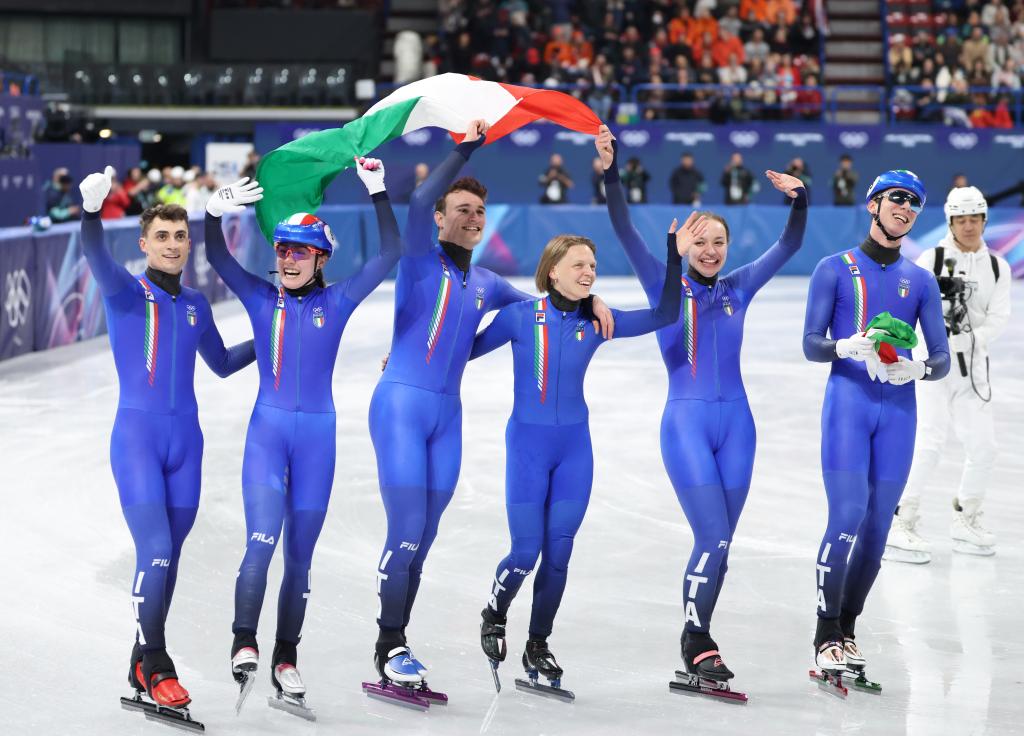 2月10日,意大利队选手庆祝夺冠。当日,米兰-科尔蒂纳冬奥会短道速滑混合团体接力决赛在意大利米兰举行,意大利队获得冠军。新华社记者 李明 摄