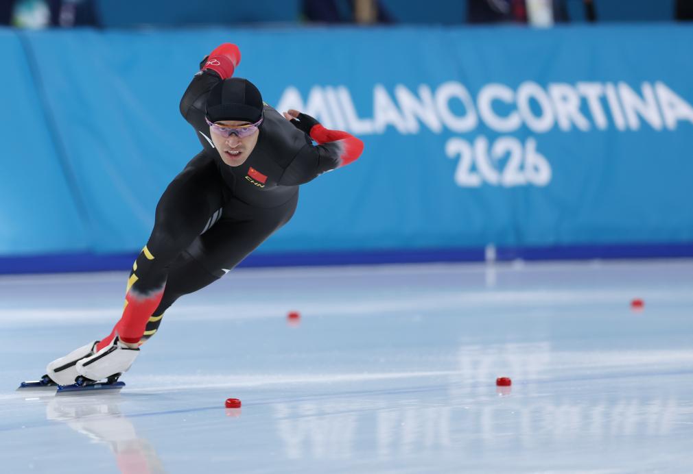 2月11日,宁忠岩在比赛中。当日,米兰-科尔蒂纳冬奥会速度滑冰男子1000米决赛在意大利米兰举行,中国选手宁忠岩获得铜牌。新华社记者 杜潇逸 摄