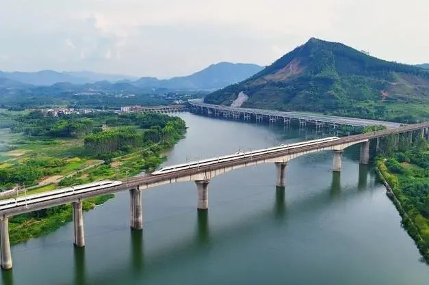 一辆高铁驶过赣州赣江特大桥,与赣州八境台隔江相望。