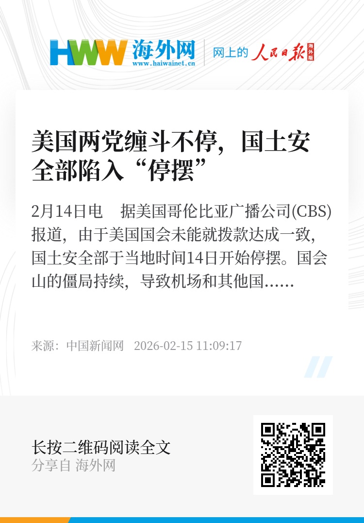 中新网2月14日电 据美国哥伦比亚广播公司(CBS)报道,由于美国国会未能就拨款达成一致,国土安全部于当地时间14日开始停摆。国会山的僵局持续,导致机场和其他国土安全部下属机构的联邦雇员陷入困境,前途未卜。
