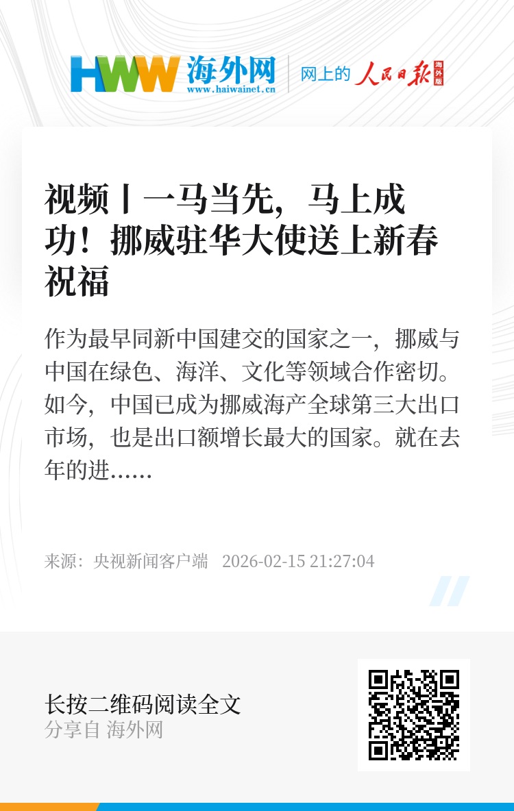 作为最早同新中国建交的国家之一,挪威与中国在绿色、海洋、文化等领域合作密切。如今,中国已成为挪威海产全球第三大出口市场,也是出口额增长最大的国家。就在去年的进博会上,鲜活的挪威面包蟹与棕奶酪正式叩开中国市场大门,越来越多的挪威味道摆上中国百姓餐桌。挪威驻华大使戴伟恩,今年第二次在中国过春节。在他看来,与家人和朋友团聚、享用美食,是节日中最温暖的部分。戴伟恩表示,刚刚过去的蛇年,中挪两国关系硕果累累、稳步向前,期待在马年与中国开展更密切合作,并送上最应景的祝福“马上成功”。