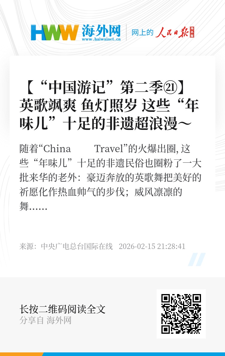 随着“China Travel”的火爆出圈,这些“年味儿”十足的非遗民俗也圈粉了一大批来华的老外:豪迈奔放的英歌舞把美好的祈愿化作热血帅气的步伐;威风凛凛的舞狮把满满福气“舞”进千家万户;流光溢彩的鱼灯,带着思念和祝福在街巷穿梭;璀璨夺目的“打铁花”用最绚烂的方式点亮夜空,也点燃了新年的期盼……