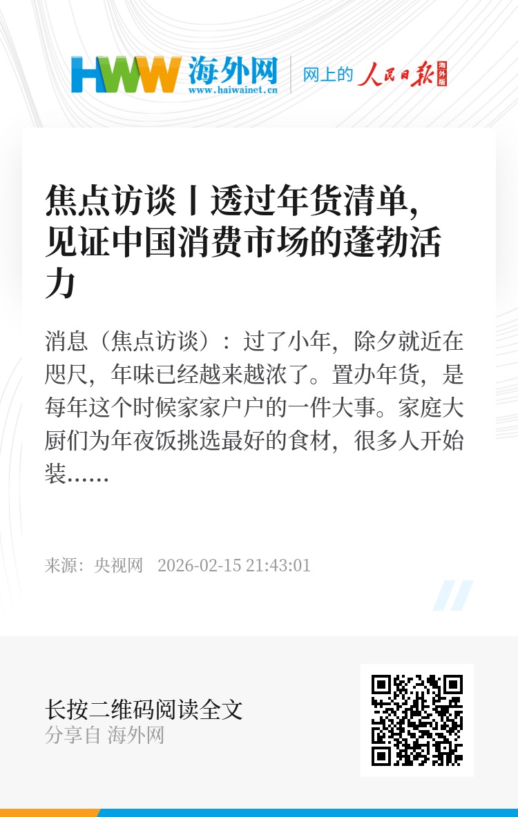 从逛传统大集到准备一场全家出游,从最新款的科技产品到充满中国文化元素的玩偶,丰富购物车的方式越来越多。年货消费给我们呈现的不仅是春节这样一个最重要的节日里人们的选择,更是中国市场、中国文化为所有人提供的可以想象和实现的生活方式。这一份份新年货,装着烟火气里的团圆期盼,藏着融在年味中的文化根脉,也见证着中国消费市场的蓬勃活力与文化自信的不断提升。