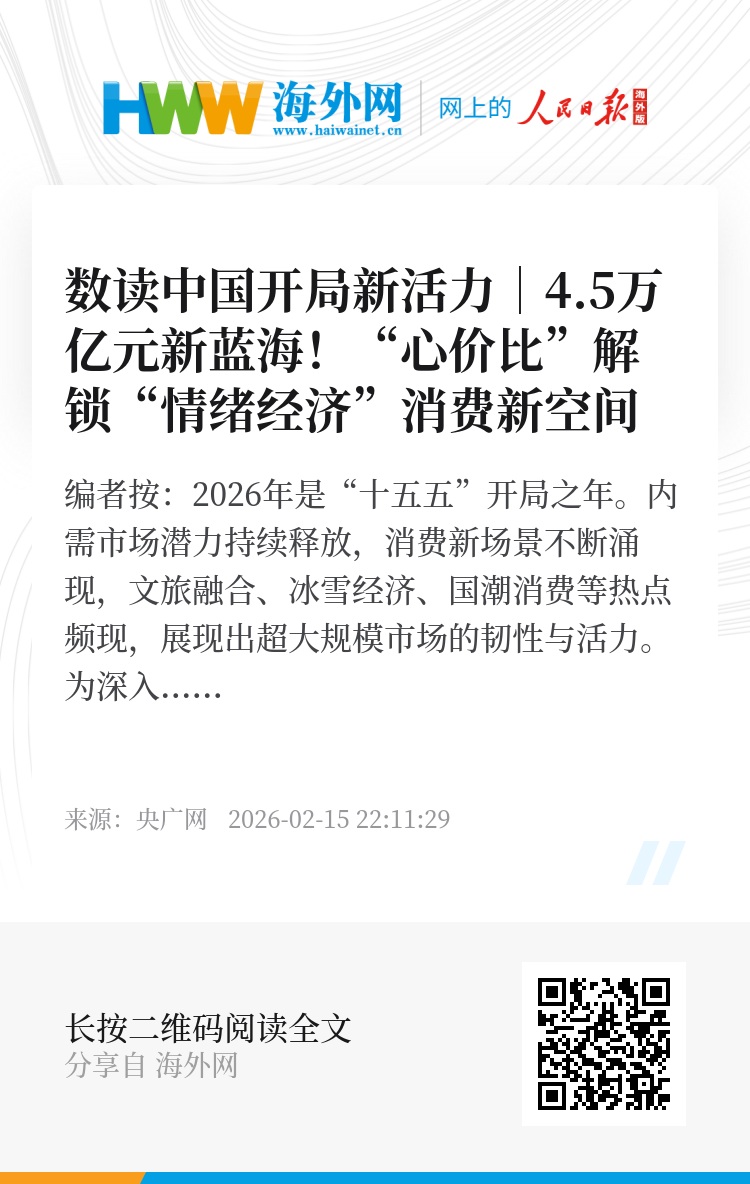 编者按:2026年是“十五五”开局之年。内需市场潜力持续释放,消费新场景不断涌现,文旅融合、冰雪经济、国潮消费等热点频现,展现出超大规模市场的韧性与活力。为深入解读开局新气象,央广网推出《数读中国开局新活力》系列报道,以数据为支撑,聚焦各地消费场景、产业升级与民生改善的生动实践,呈现中国经济稳中求进、活力迸发的时代图景。