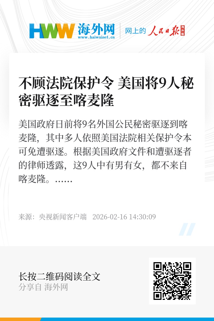 美国政府日前将9名外国公民秘密驱逐到喀麦隆,其中多人依照美国法院相关保护令本可免遭驱逐。