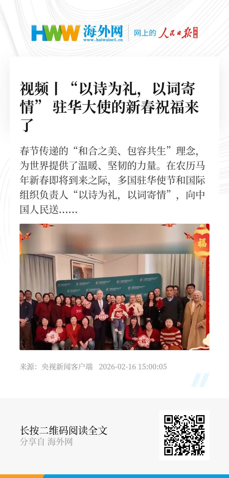 春节传递的“和合之美、包容共生”理念,为世界提供了温暖、坚韧的力量。在农历马年新春即将到来之际,多国驻华使节和国际组织负责人“以诗为礼,以词寄情”,向中国人民送上诚挚的新春祝福。