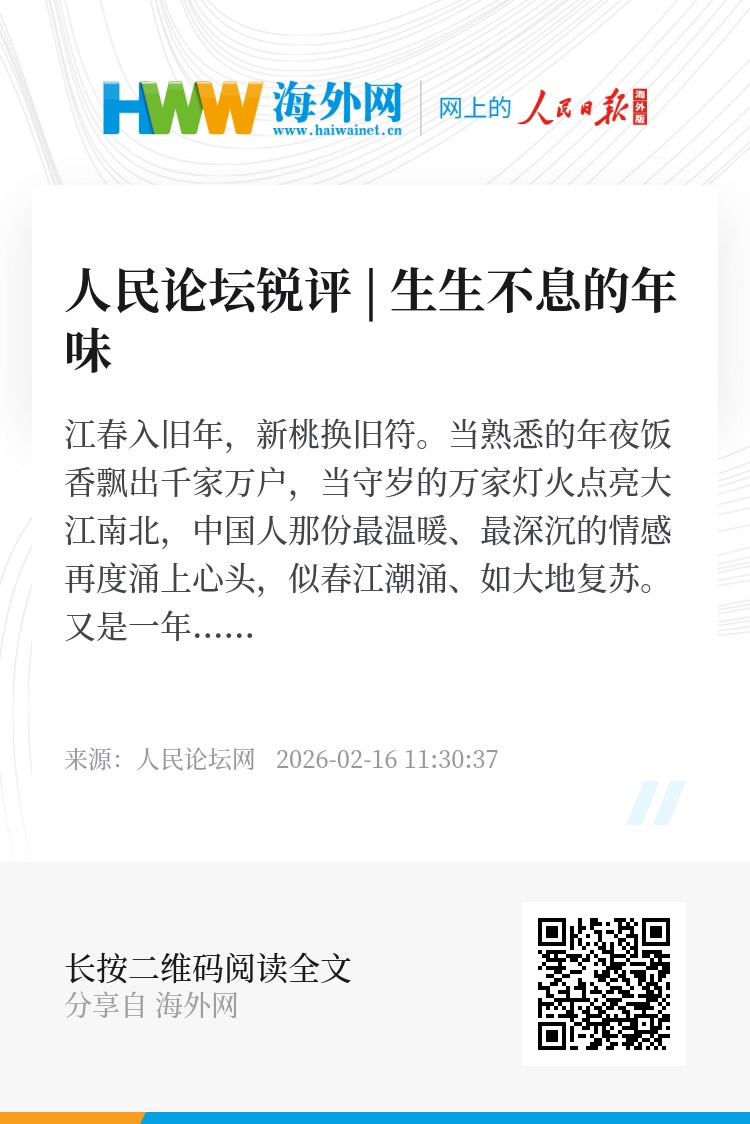 年味在传承中创新,在创新中传承。我们欣喜地看到,古老的年俗正被赋予时代新意:博物馆里举办沉浸式年俗展,Z世代在互动体验中读懂春节密码;非遗技艺通过短视频活化,AI技术辅助创作春联、生成个性化年画,为传统艺术注入智能气息;“云端”守岁、跨域连线,让团圆突破物理边界。这不断创新表达的年味,正与今日之中国同频共振——在“日子越过越红火”的乡村,数字直播传递着丰收的喜悦;在现代化都市,电子烟花诠释着绿色发展理念;在海外,“中国年”日益成为文明交流互鉴的亮丽风景……年味,就这样从家出发,与国同行,与世界相连。